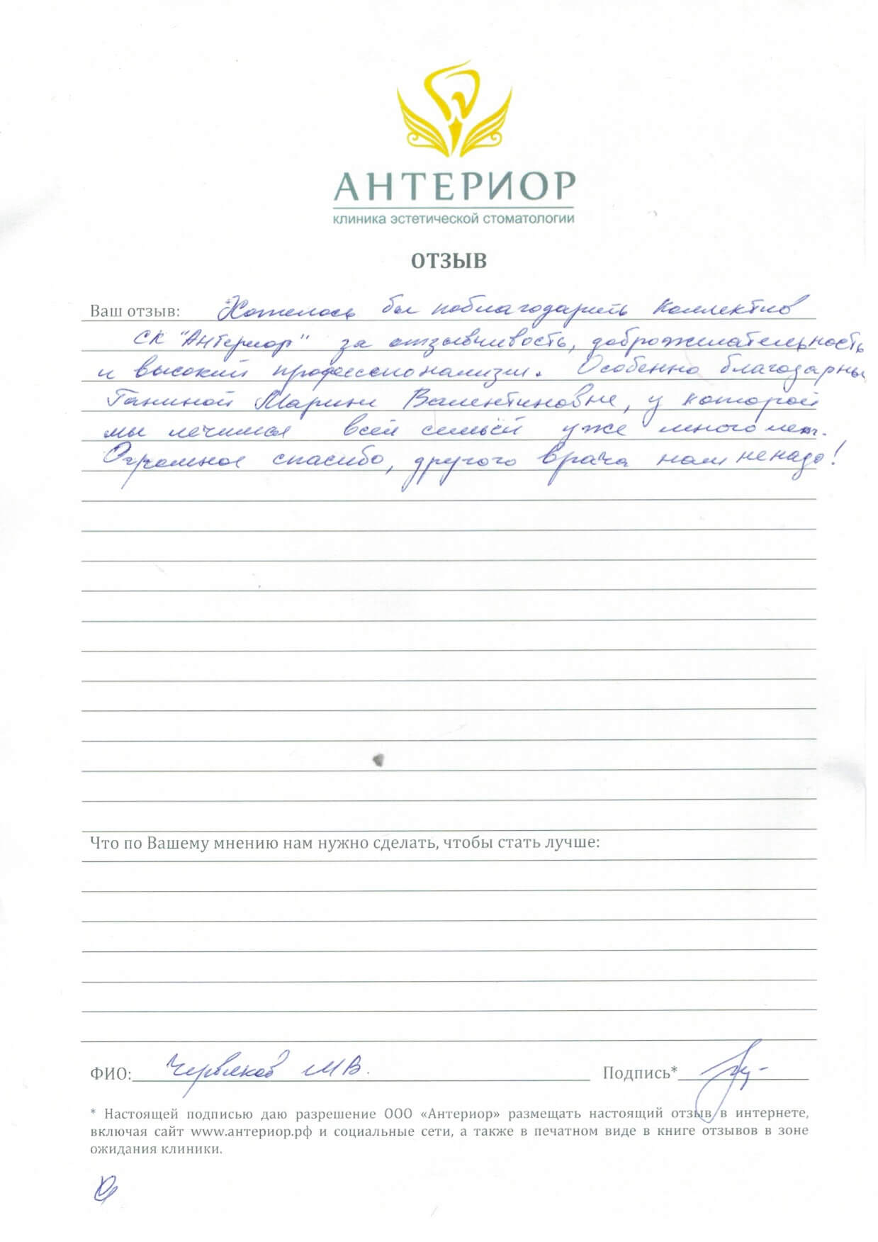 Хотелось бы поблагодарить коллектив ск «Антериор» за отзывчивость, доброжелательность и высокий профессионализм. Особенно благодарны Ганиной Марине Валентиновне, у которой мы лечились всей семьей уже много лет. Огромное спасибо, другого врача нам не надо!