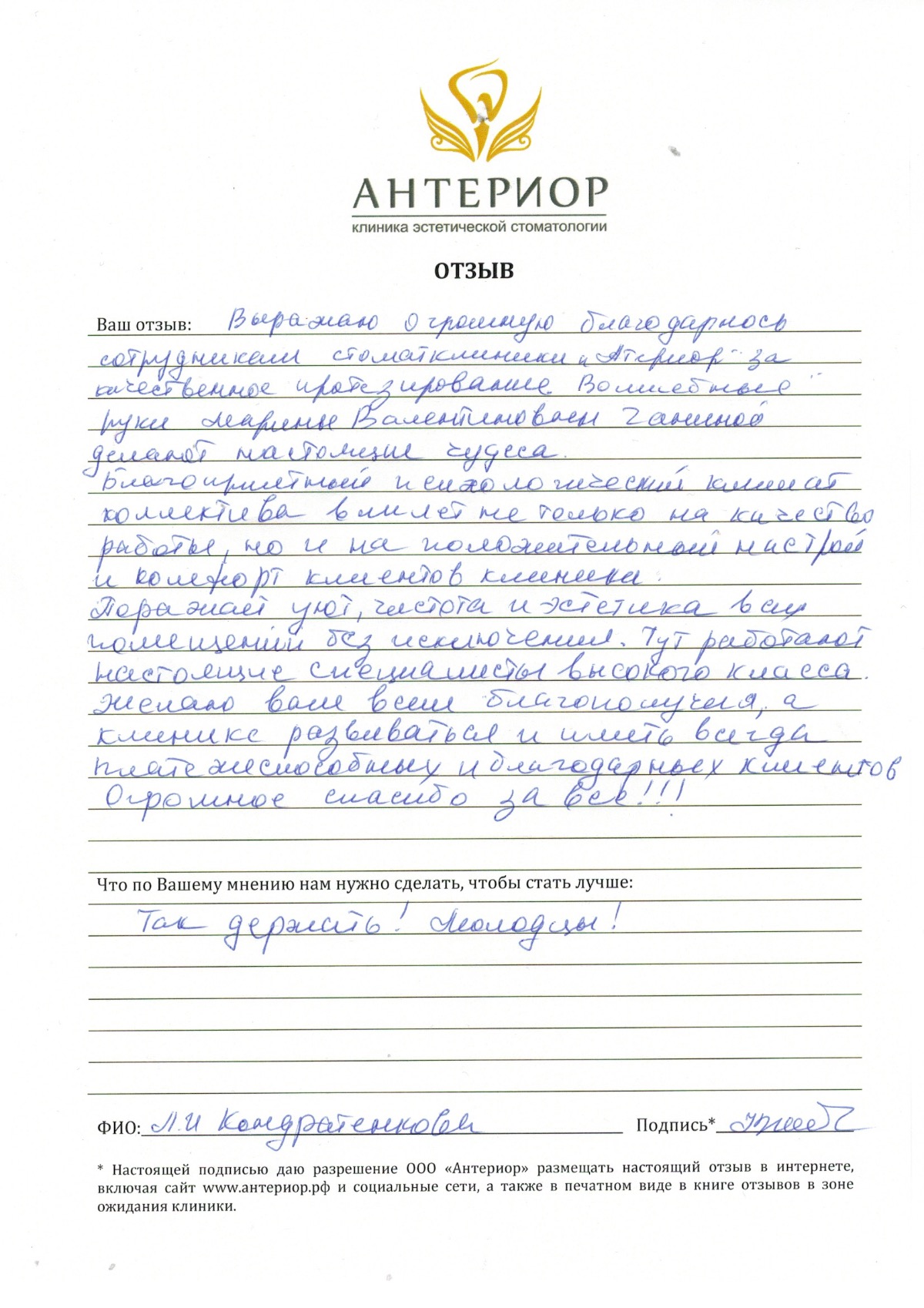 Выражаю огромную благодарность сотрудникам стоматологической клиники Антериор за качественное протезирование. Волшебные руки Марины Валентиновны Ганиной делают настоящие чудеса. Благоприятный психологический климат коллектива влияет не только на качество работы, но и на положительный настрой и комфорт клиентов клиники. Поражает уют, чистота и эстетика всех помещений без исключения. Тут работают настоящие специалисты высокого класса. Желаю вам всем благополучия, а клинике развиваться и иметь всегда платежеспособных и благодарных клиентов. Огромное спасибо за все! Так держать! Молодцы!