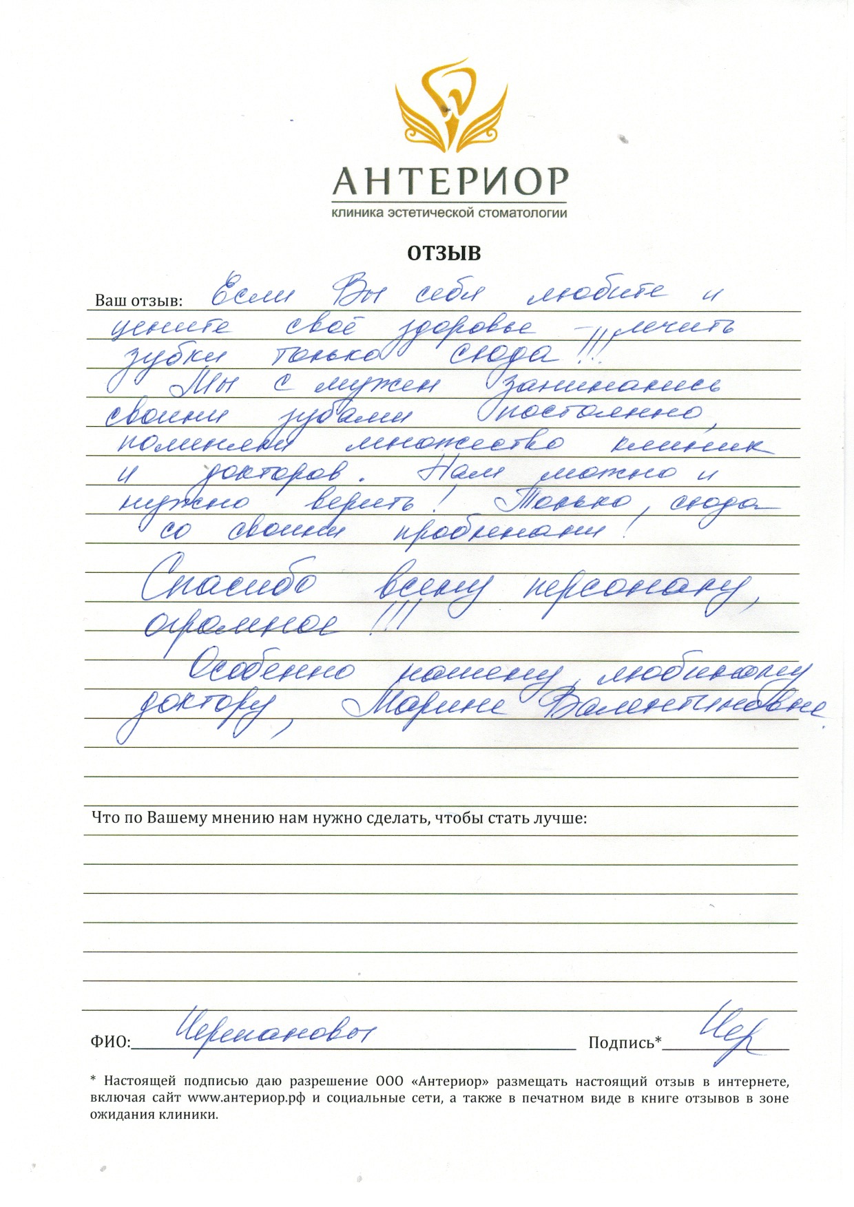 Мы с мужем занимались своими зубами постоянно, поменяли множество клиник и докторов. Нам можно и нужно верить! Только сюда со своими проблемами. Спасибо всему персоналу огромное! Особенно нашему любимому доктору, Марине Валентиновне!